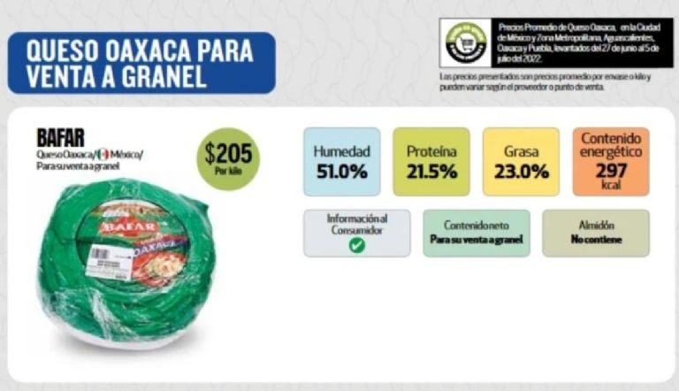 Tras los estudios, la Profeco determinó que el queso Oaxaca más económico y de mejor calidad es el Bafar. Según los resultados, este producto, disponible a granel, tiene un costo de 205 pesos por kilo y cumple con la información ofrecida a los consumidores.